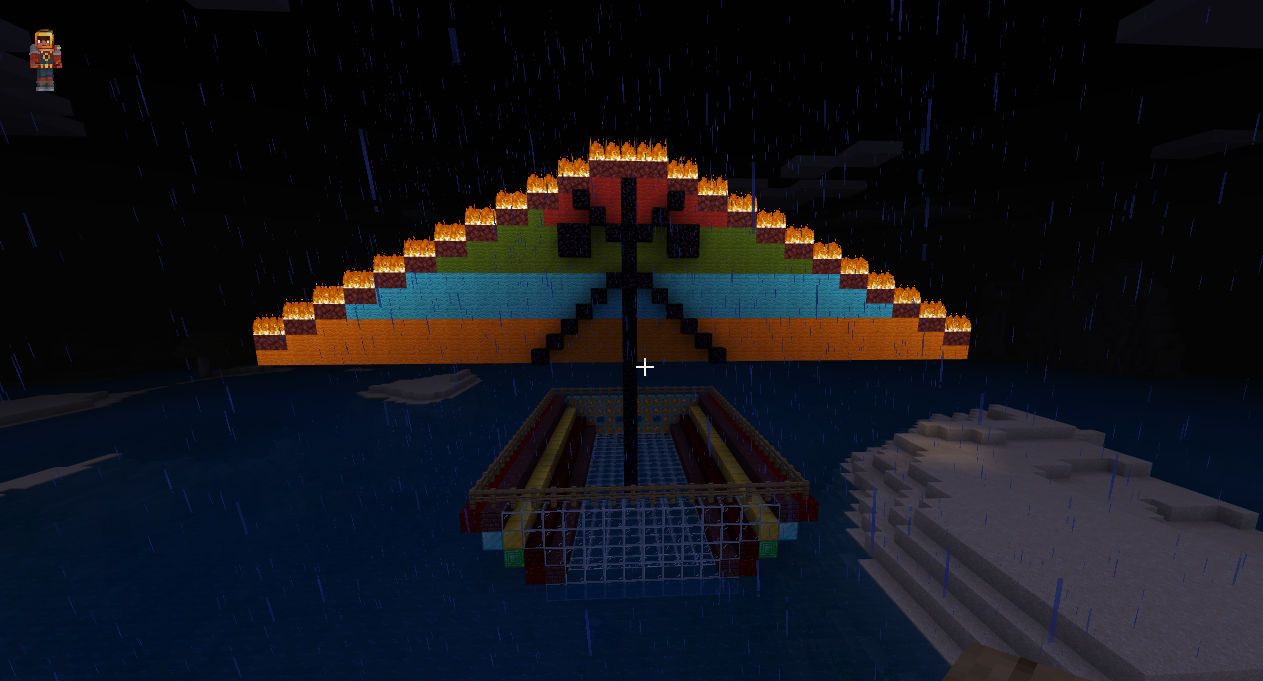 Just a little pirate ship I made took three Minecraft days to make. (that’s thirty minutes there’s ten minutes in a Minecraft day.) I had a few disasters along the way. The sail caught on fire and burned half of my sail. Then the boat caught on fire and most of it burned up.